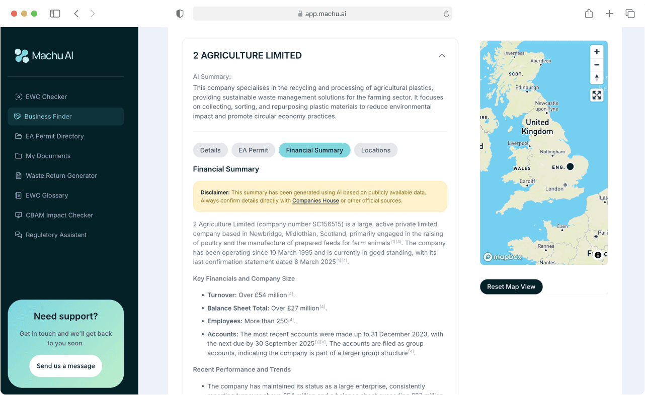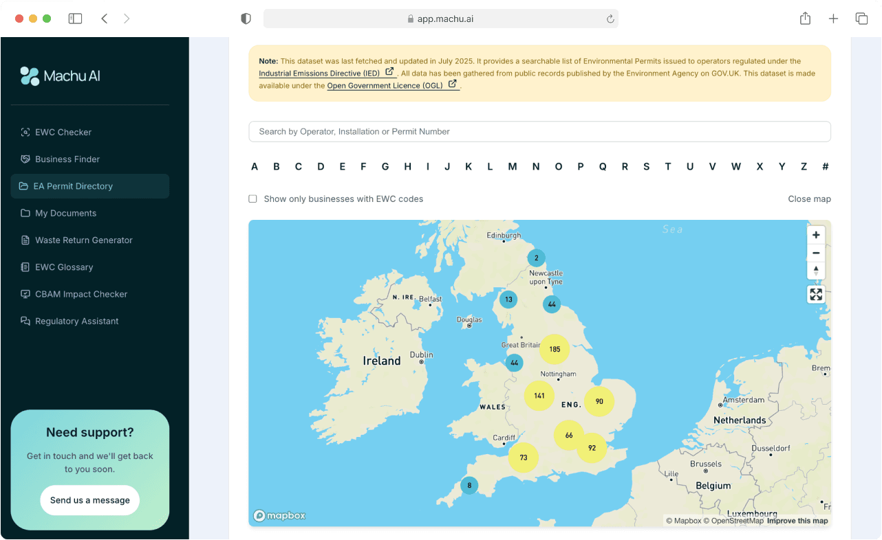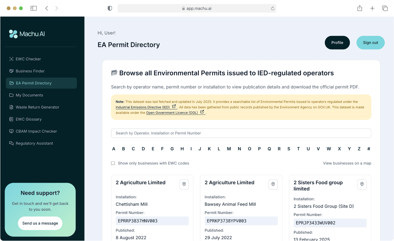 Finding Environment Agency permits shouldn't be hard work. Machu AI’s EA Permit Directory lets you easily search, filter, and download permits from over 750 publicly available IED sources.