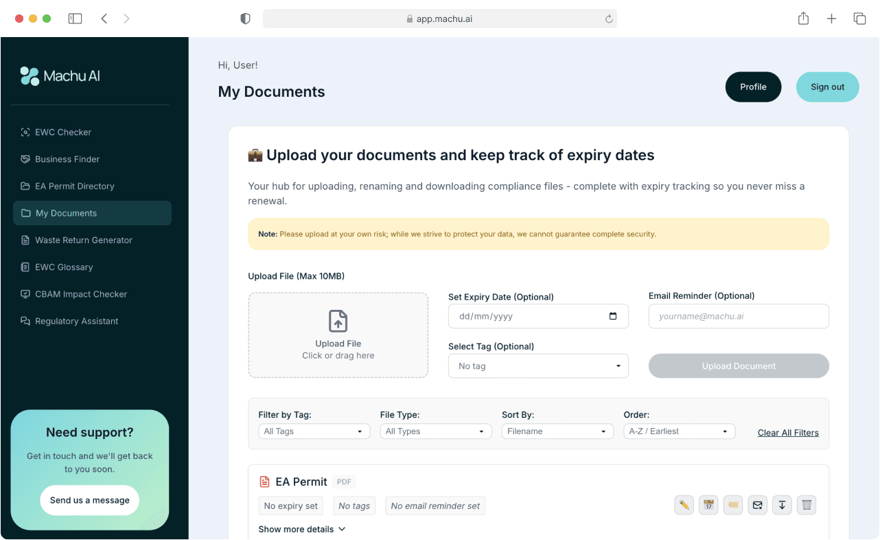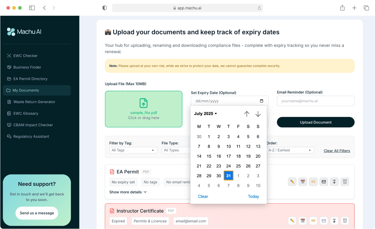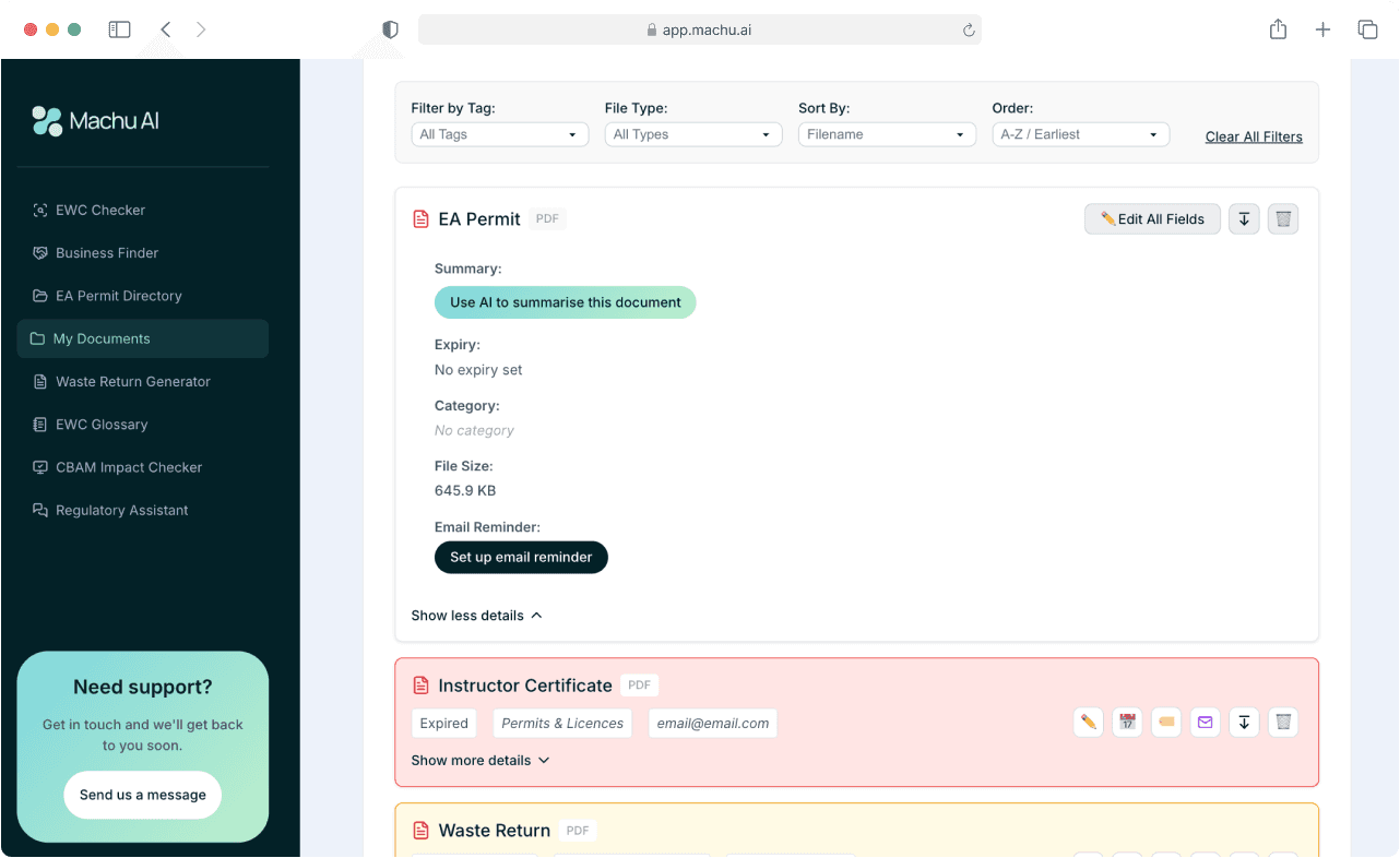 Never risk missing a crucial expiry date again. Machu AI’s My Documents feature makes managing compliance files simple, centralised, and stress-free.